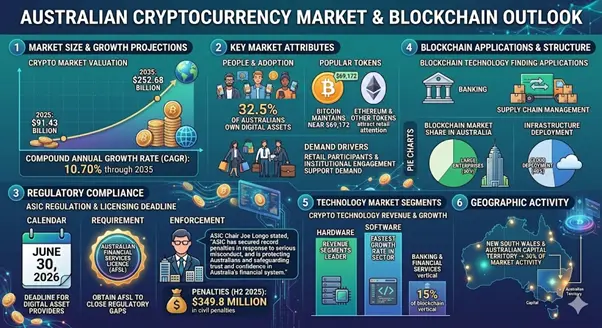 The cryptocurrency market in Australia reached a valuation of $91.43 billion in 2025. Projections indicate a compound annual growth rate of 10.70% through 2035. The total value might reach $252.68 billion by that date.