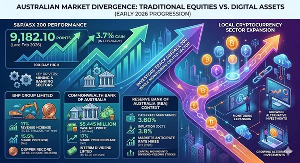 Markets in Australia display a divergence between traditional equities and digital assets as 2026 progresses. Investors track the S&P/ASX 200 Index while monitoring the expansion of the local cryptocurrency sector.