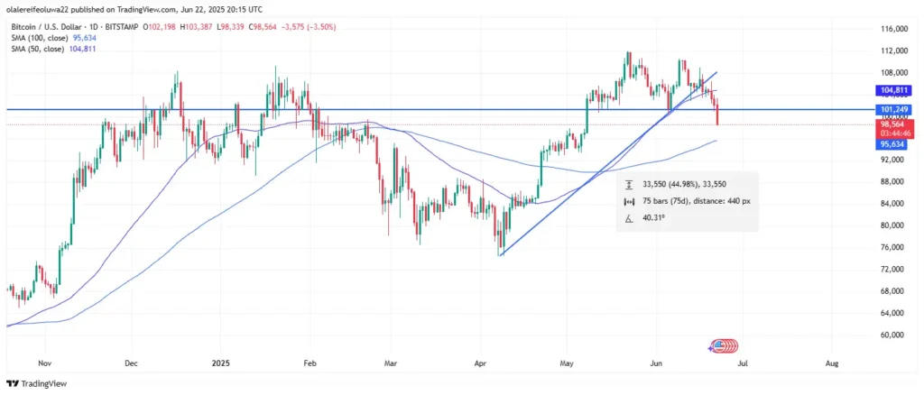 Bitcoin just hit a speed bump, and it wasn’t a small one. The digital heavyweight took a stumble as it dipped under the $99,000 line, rattled by fresh waves of geopolitical drama. The spark? A set of U.S. military strikes on Iranian nuclear sites, green-lit by President Donald Trump, which sent shockwaves across the financial landscape.